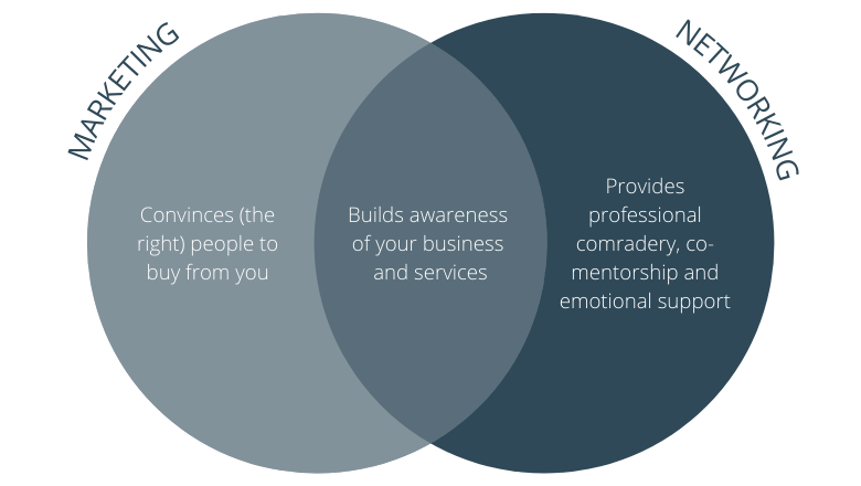 Marketing convinces (the right) people to buy from you. Networking provides professional comradery, co-mentorship and emotional support. Both marking and networking build awareness of your business and services.